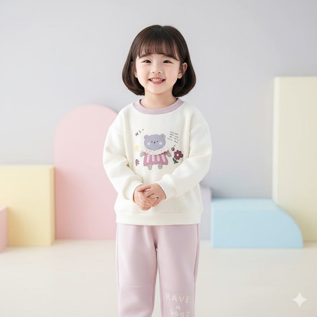 Điểm cộng lớn nhất của mẫu bộ đồ thu đông cho bé gái này chính là thiết kế. Bộ đồ gồm áo tay dài và quần dài, phối màu tinh tế theo phong cách Hàn Quốc nhẹ nhàng, hiện đại.